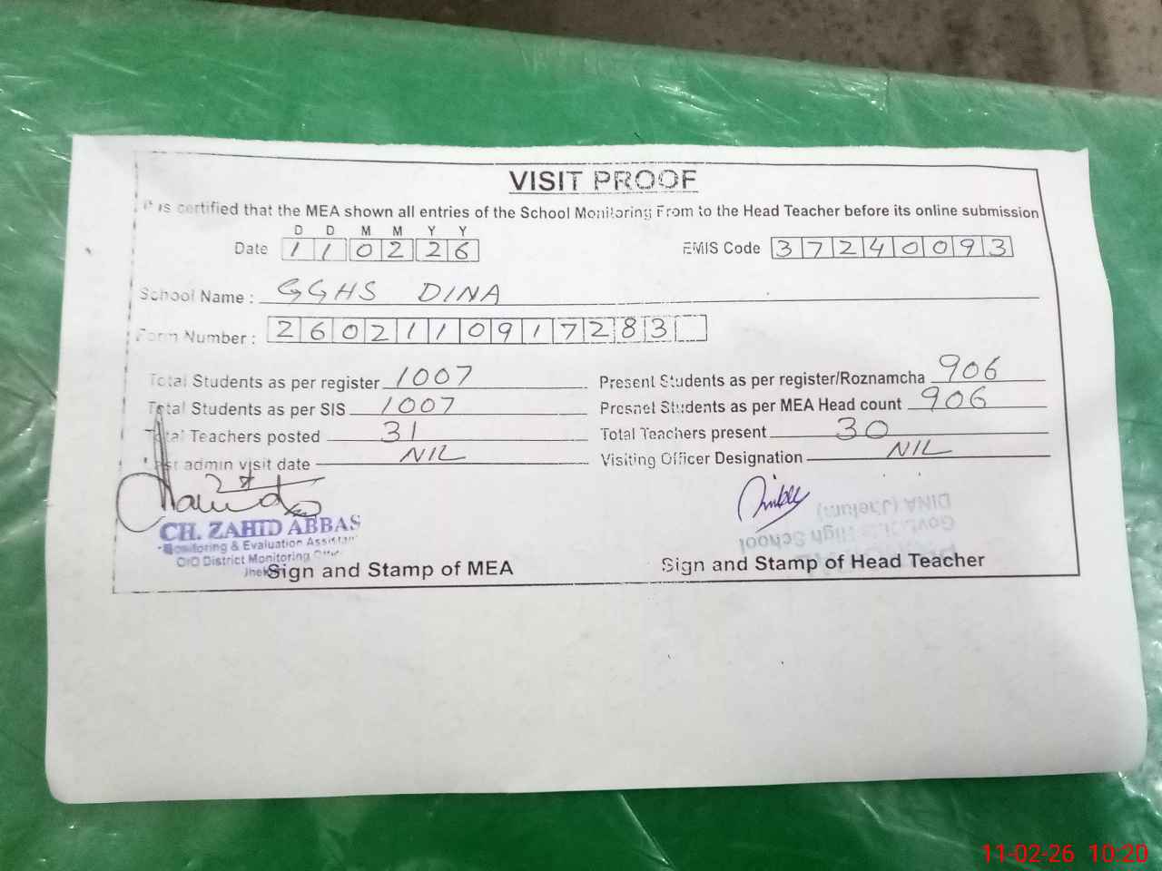| Attendance Register | Head Teacher | MEA with School | Visit Proof |