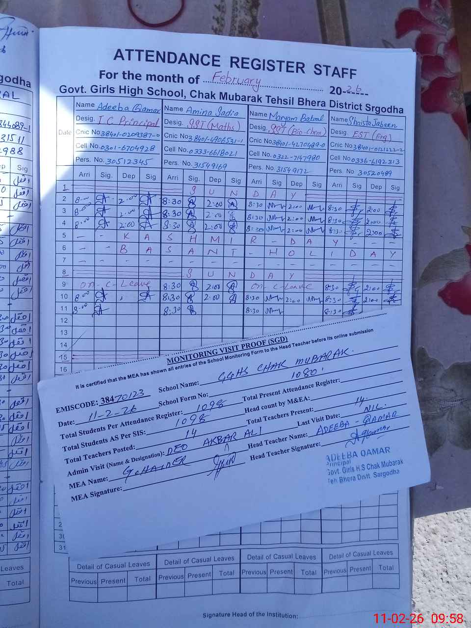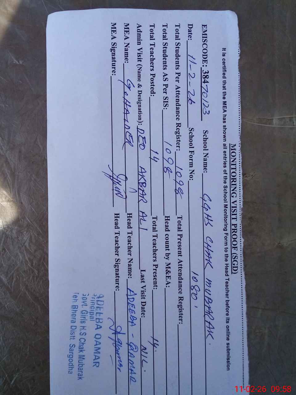 | Name: AD**** QA**** Designation: (School Headmaster's/Headmistress's) SST Phone/Cell Number: 03**** |