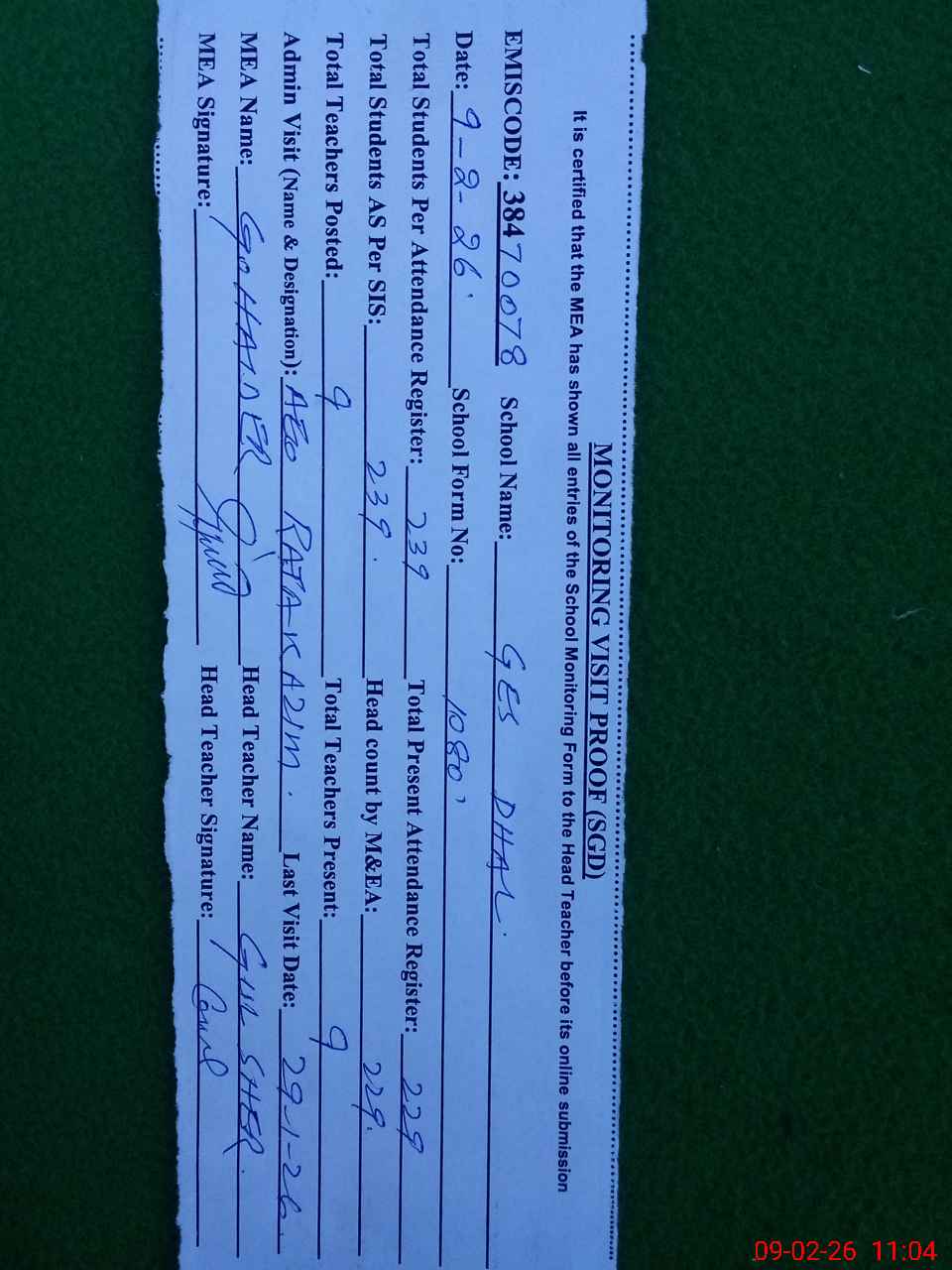 | Attendance Register | Head Teacher | MEA with School | Visit Proof |