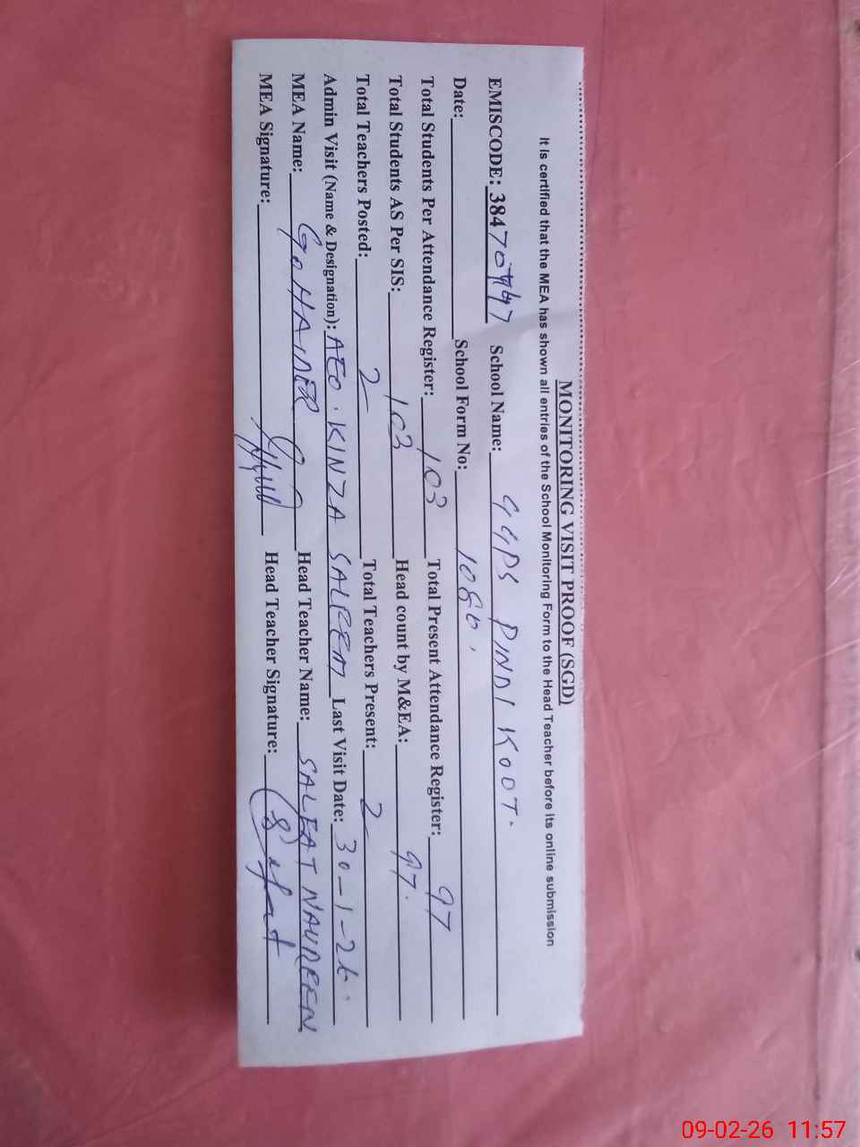 | Attendance Register | Head Teacher | MEA with School | Visit Proof |