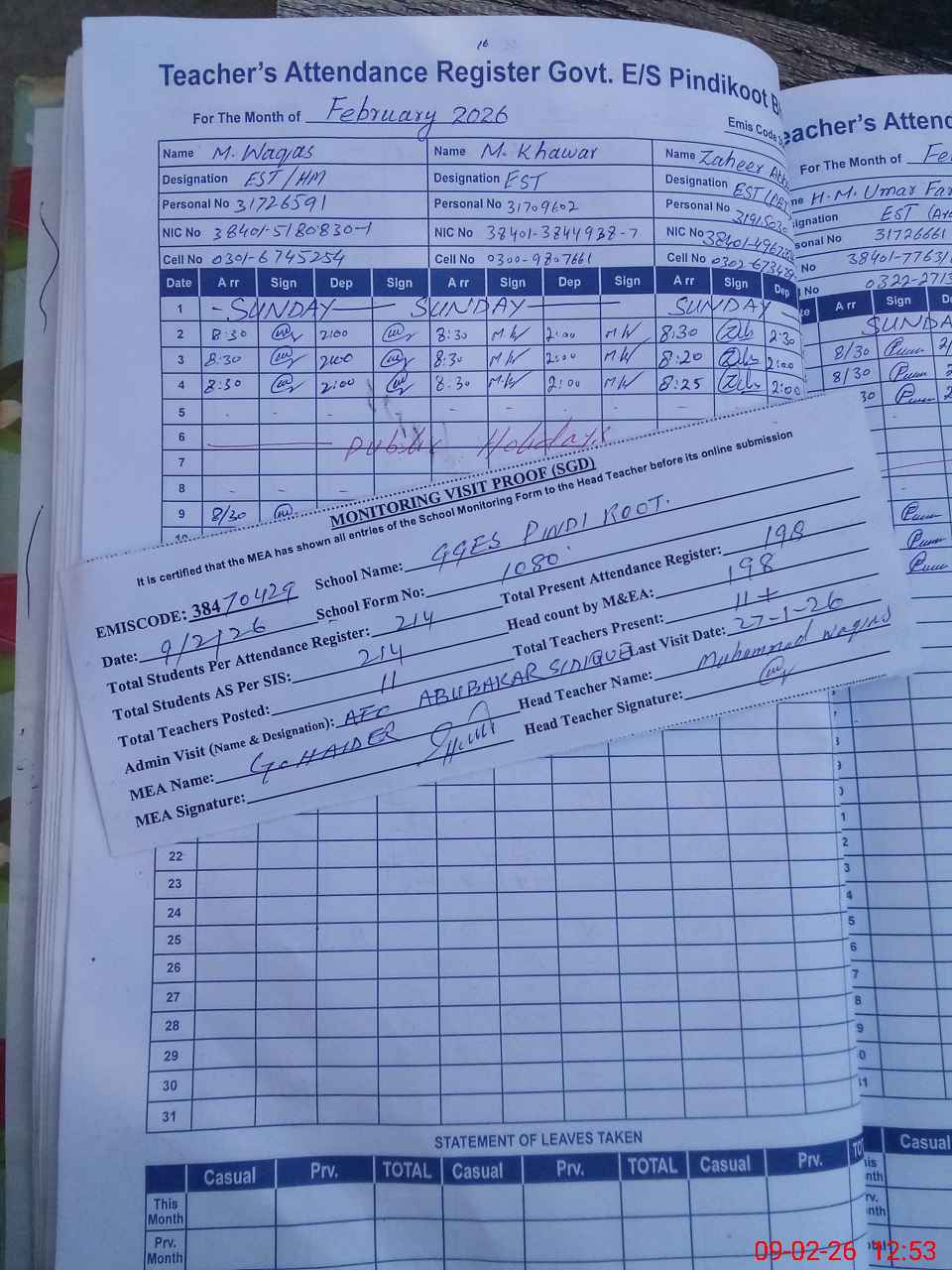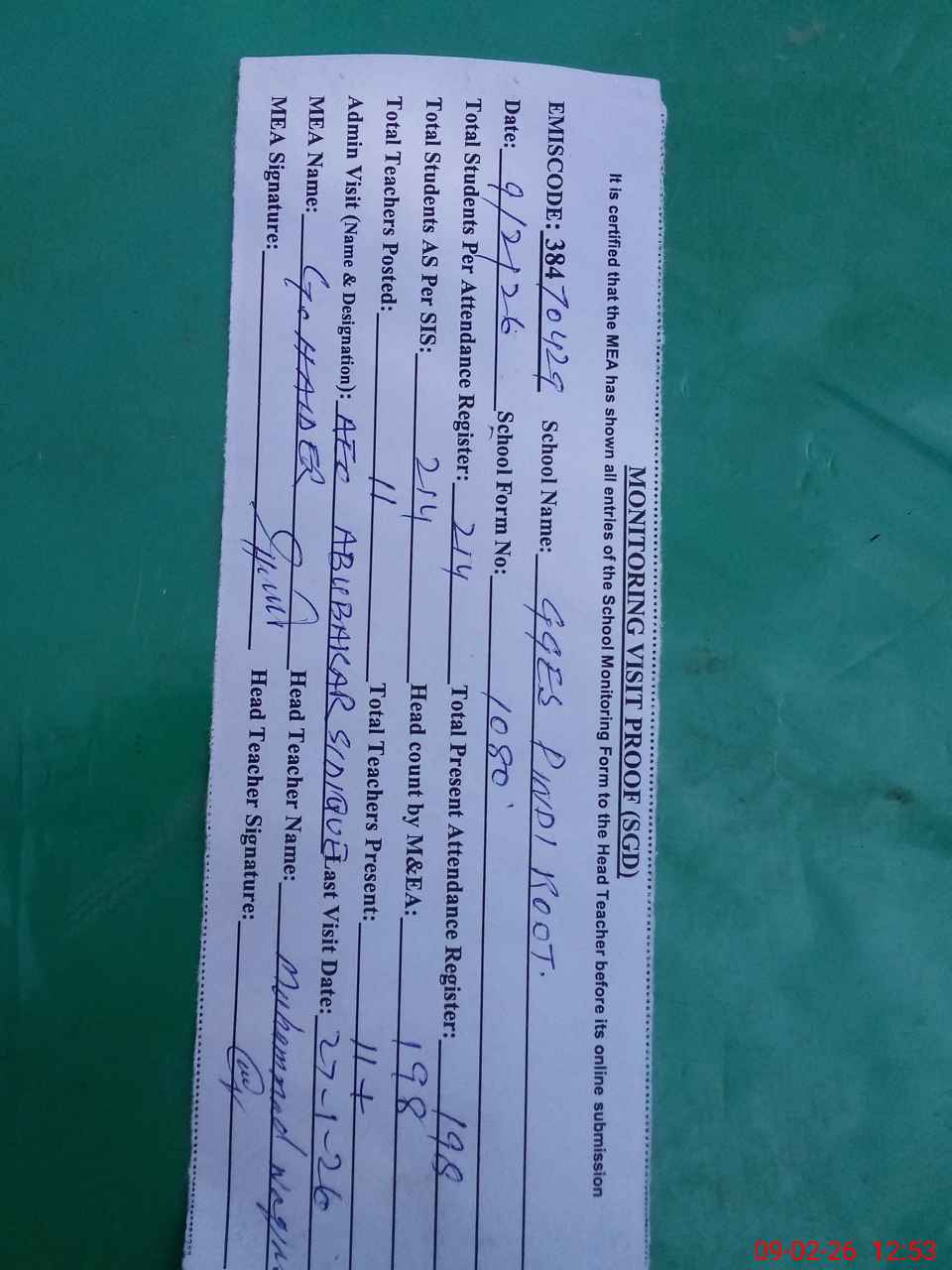 | Attendance Register | Head Teacher | MEA with School | Visit Proof |
