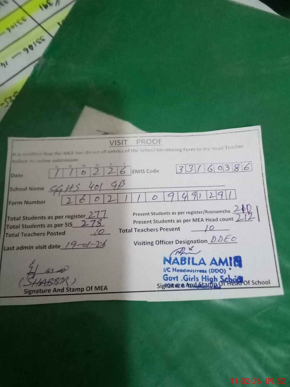 | Certified that this School was Inspected by the Undersigned MEA/DMO Today and the Information Stated Above is as Per Record. | |||||