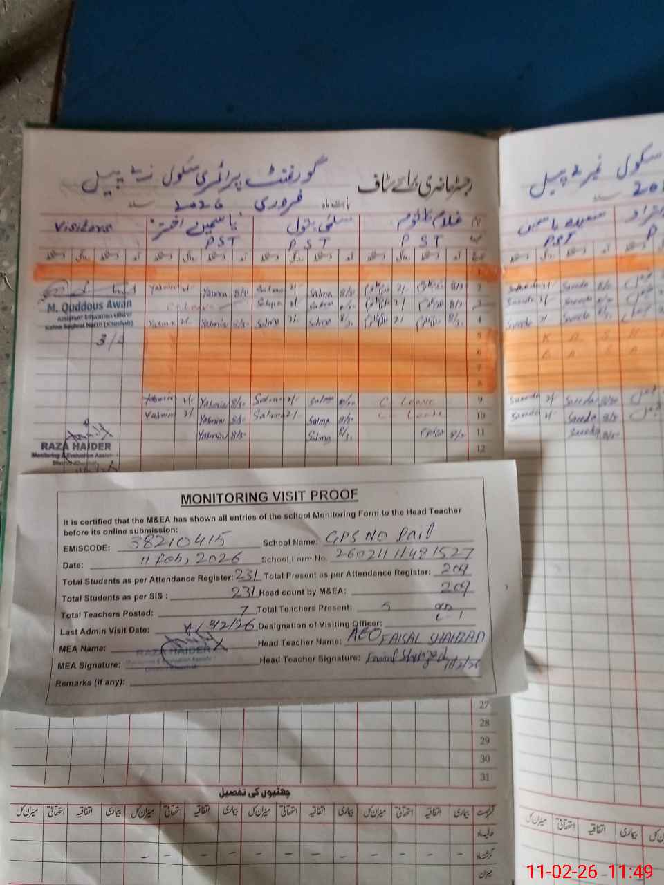 | Attendance Register | Head Teacher | MEA with School | Visit Proof |