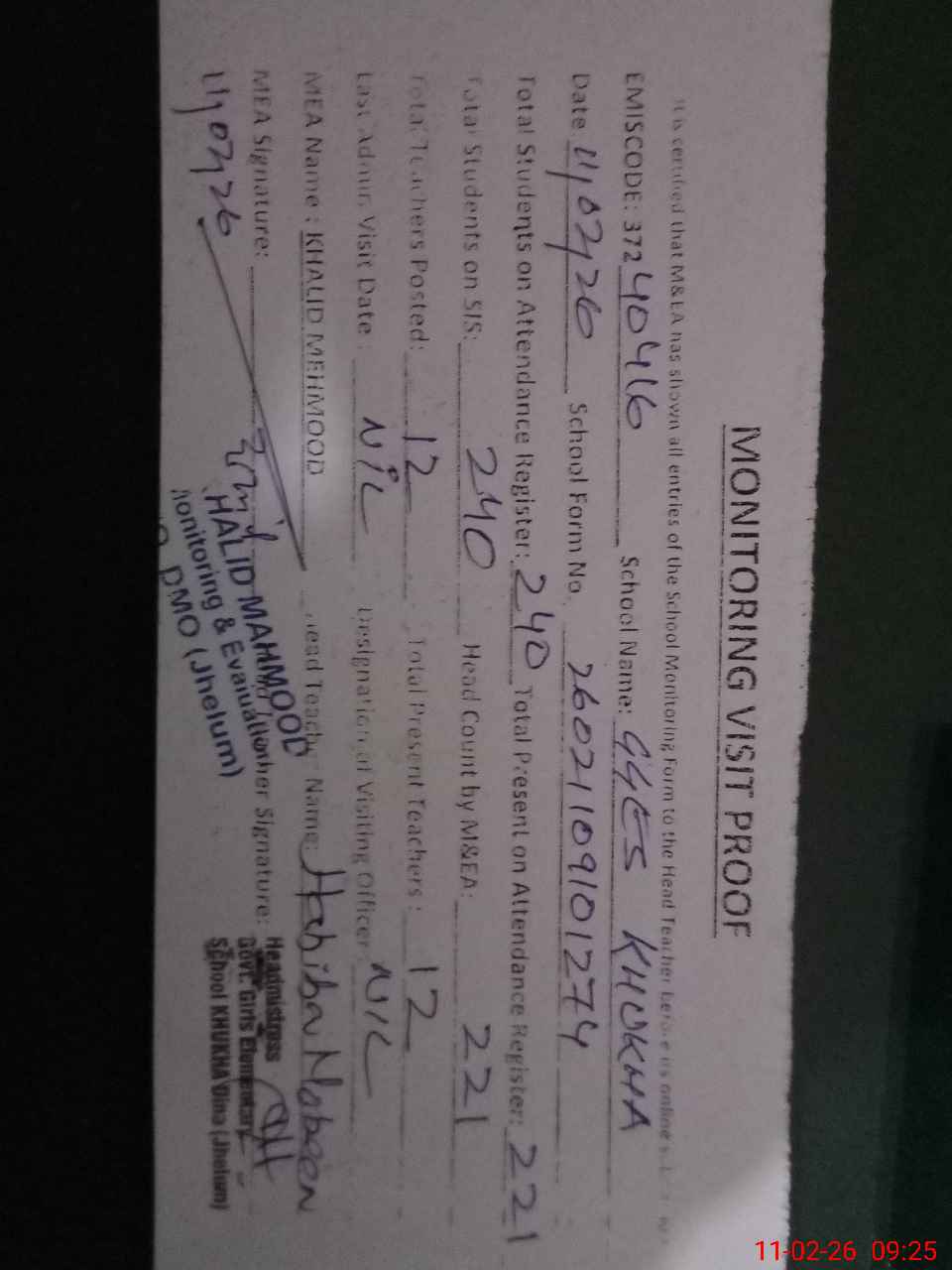 | Certified that this School was Inspected by the Undersigned MEA/DMO Today and the Information Stated Above is as Per Record. | |||||