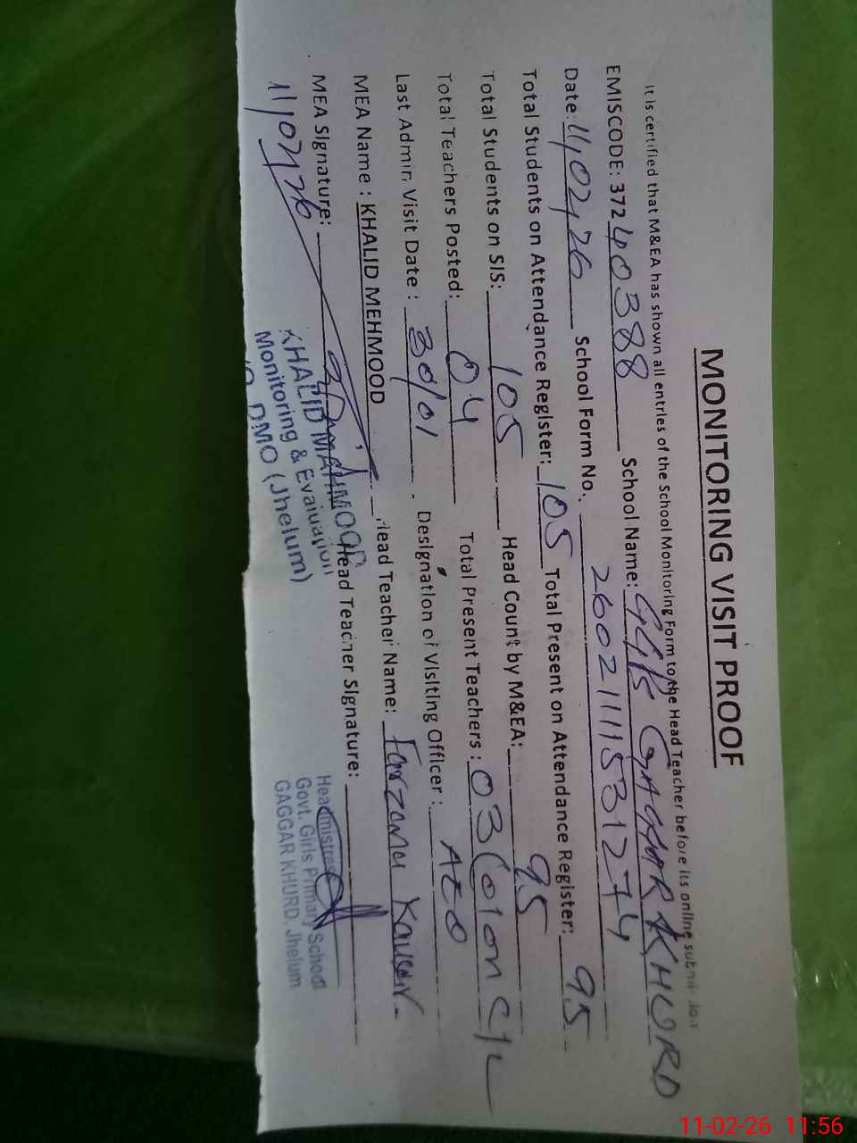| Attendance Register | Head Teacher | MEA with School | Visit Proof |