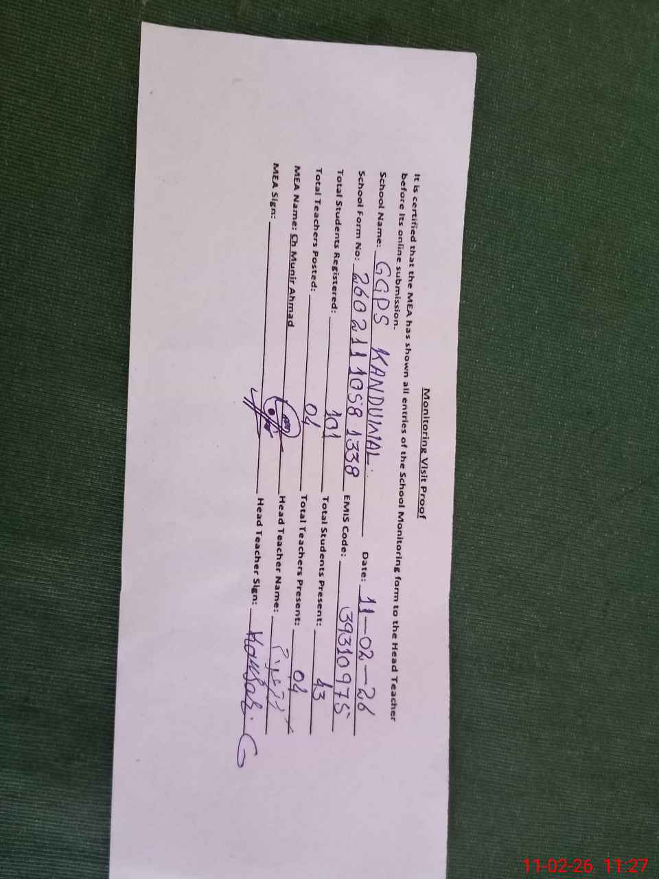 | Attendance Register | Head Teacher | MEA with School | Visit Proof |