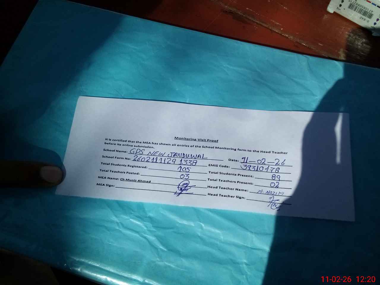| Attendance Register | Head Teacher | MEA with School | Visit Proof |