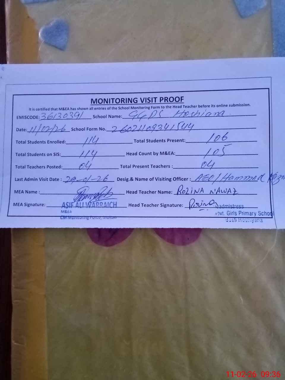 | EMIS Code: 36130391 | Name of School: GGPS HOSHIANA P/O NAI WALA' | |||
