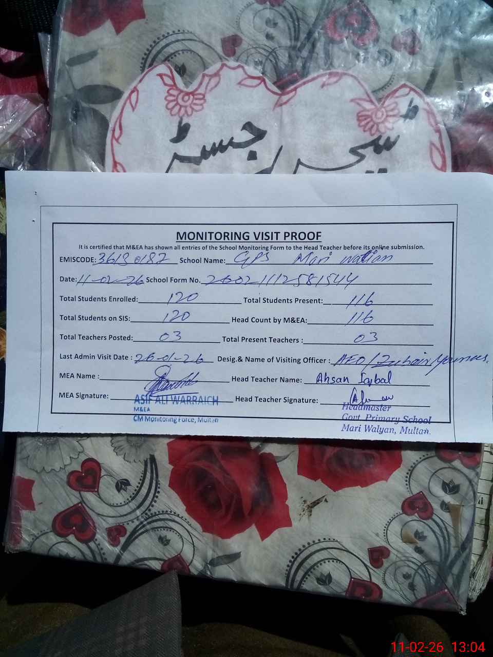 | Attendance Register | Head Teacher | MEA with School | Visit Proof |