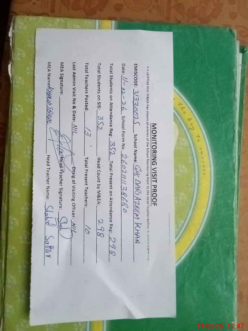 | Attendance Register | Head Teacher | MEA with School | Visit Proof |