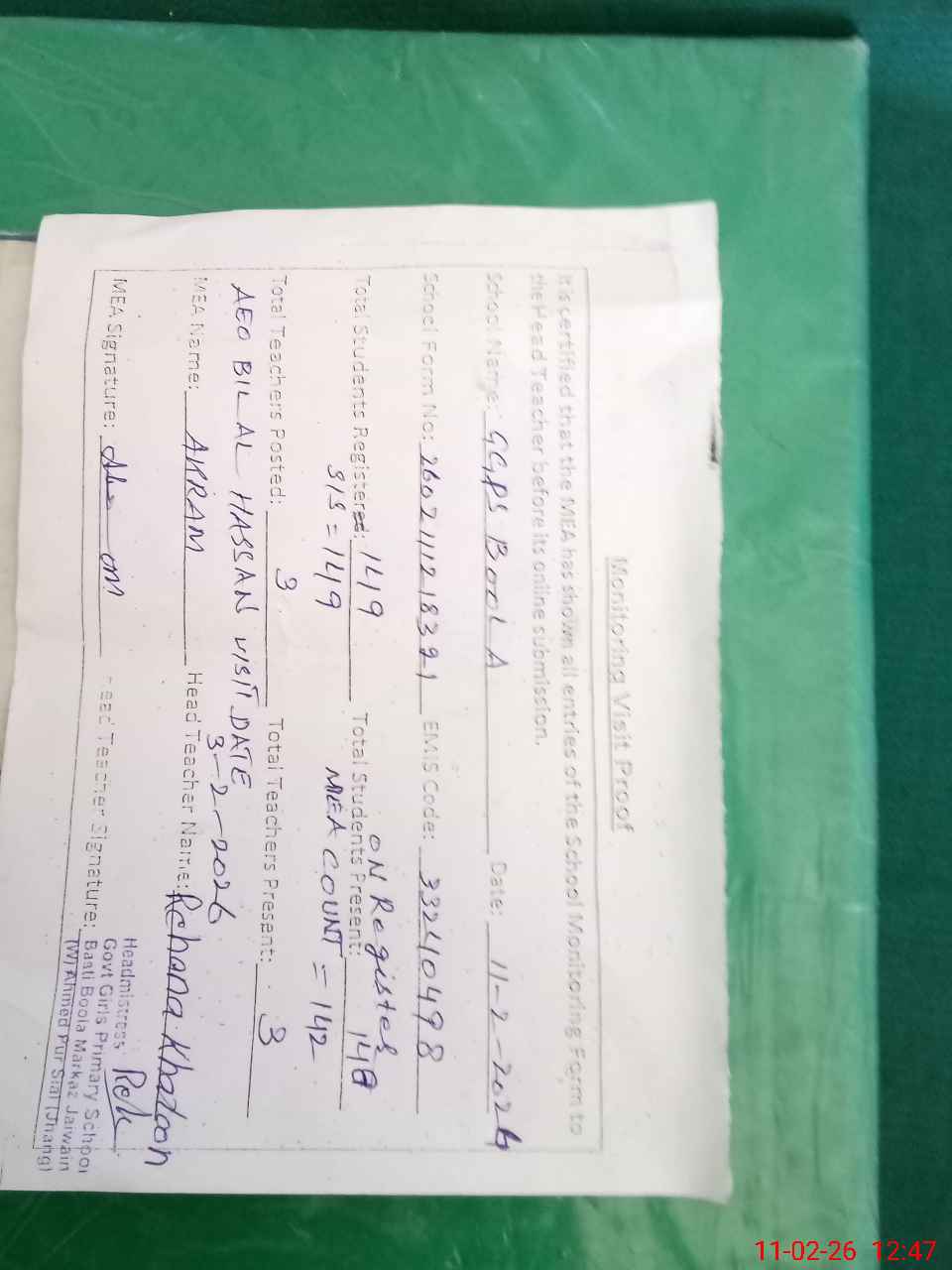| Attendance Register | Head Teacher | MEA with School | Visit Proof |