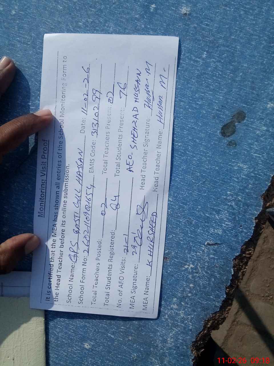 | Monitoring Date: 11-02-2026 | Start Time: 11-02-2026 09:02 AM | End Time: 11-02-2026 09:18 AM | Name of MEA: Kh**** Ah**** | |