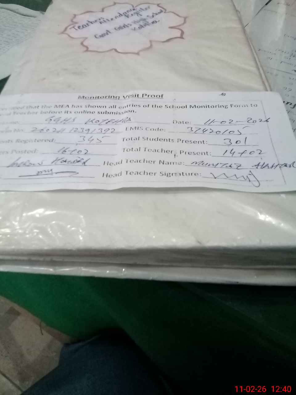 | Attendance Register | Head Teacher | MEA with School | Visit Proof |