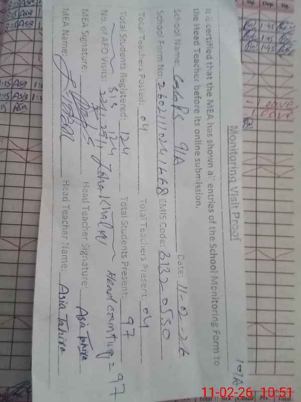 | Attendance Register | Head Teacher | MEA with School | Visit Proof |
