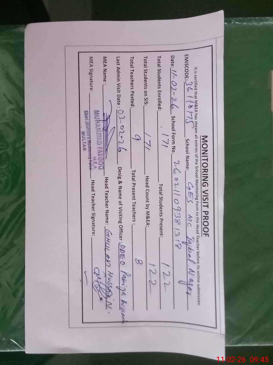 | EMIS Code: 36110175 | Name of School: GES MC IQBAL NAGAR | |||