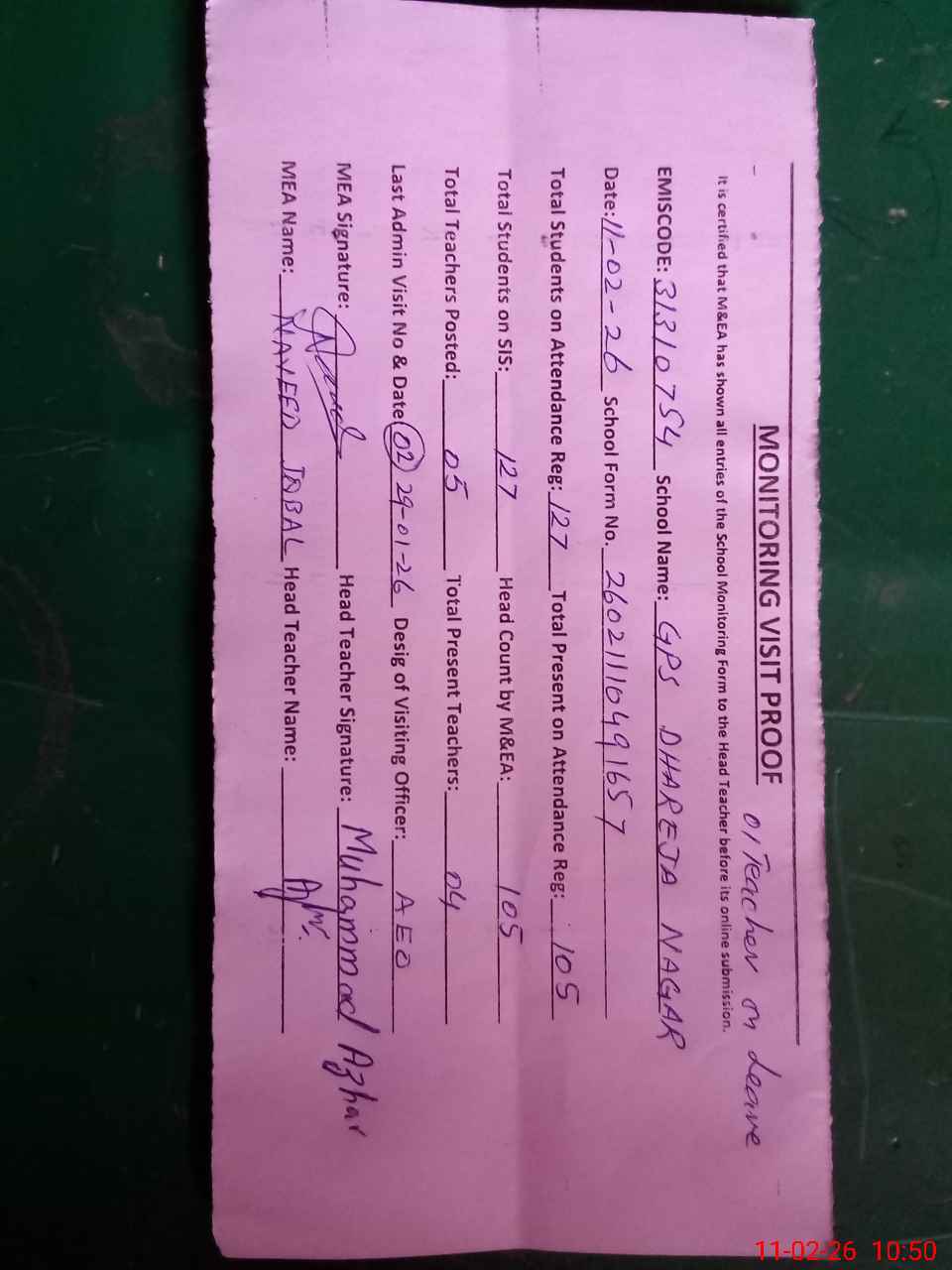 | Attendance Register | Head Teacher | MEA with School | Visit Proof |