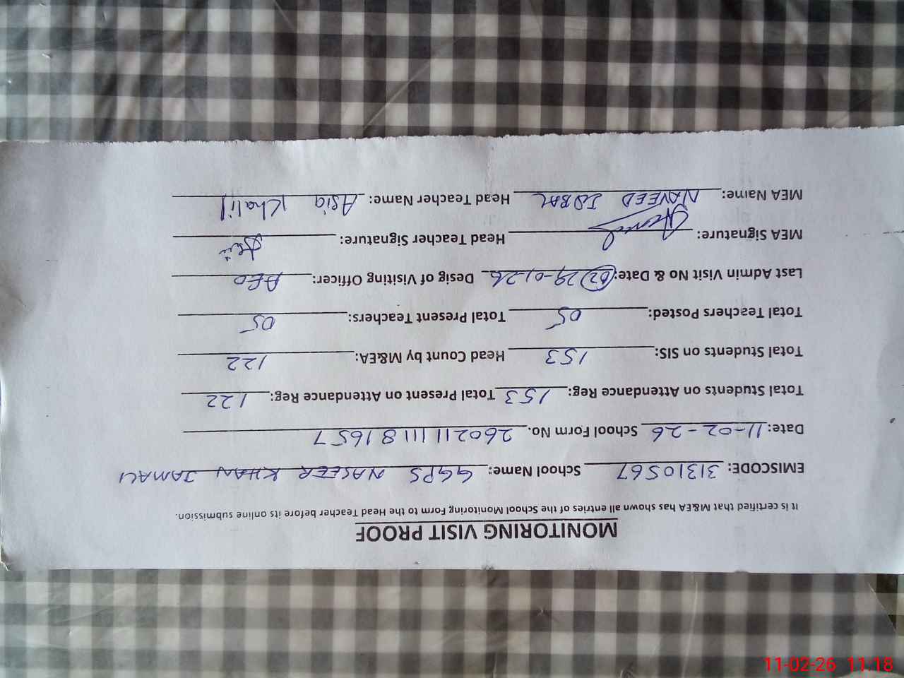 | EMIS Code: 31310567 | Name of School: GGPS NASEER KHAN JAMALI | |||