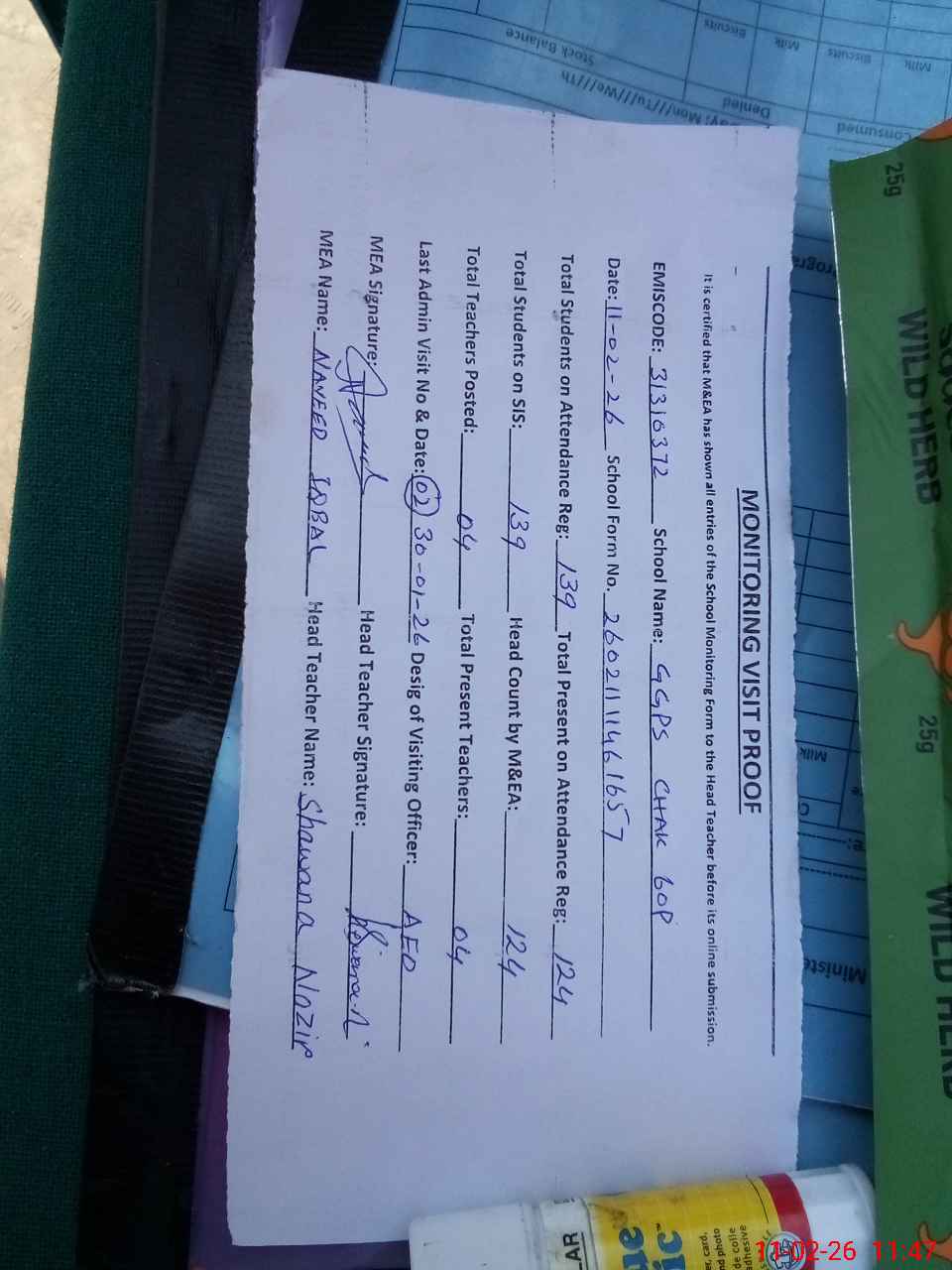 | Attendance Register | Head Teacher | MEA with School | Visit Proof |
