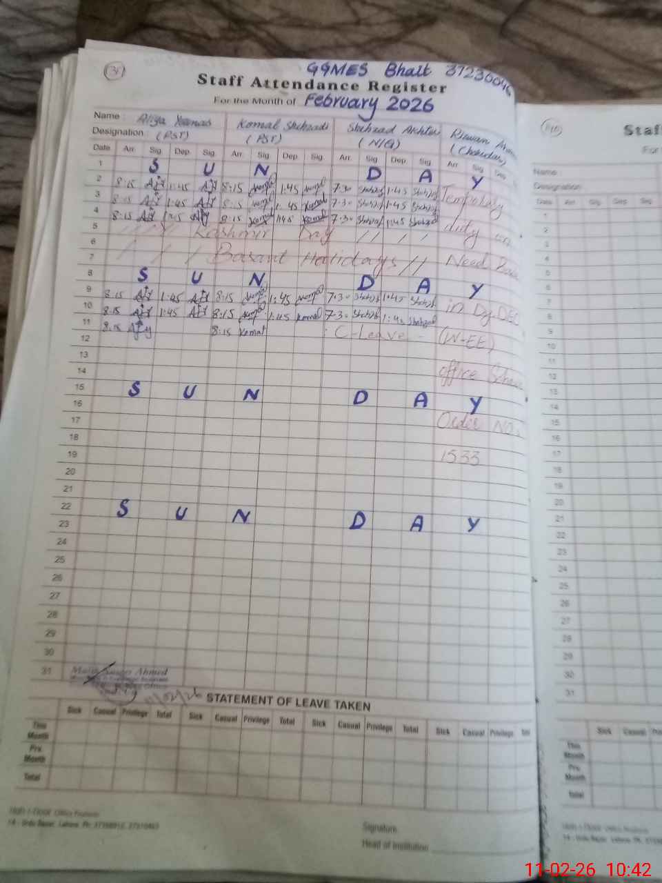 | 61**** | Mu**** Am**** Kh**** | Temporary | 12 | 0 | 0 | 12 | 0 | 0 | 0 | 0 | 0 | Maternity | |