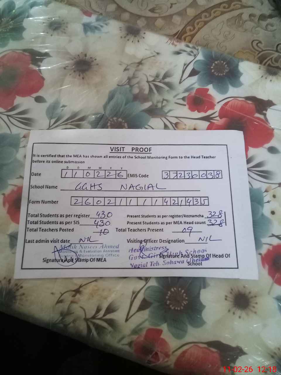 | Attendance Register | Head Teacher | MEA with School | Visit Proof |