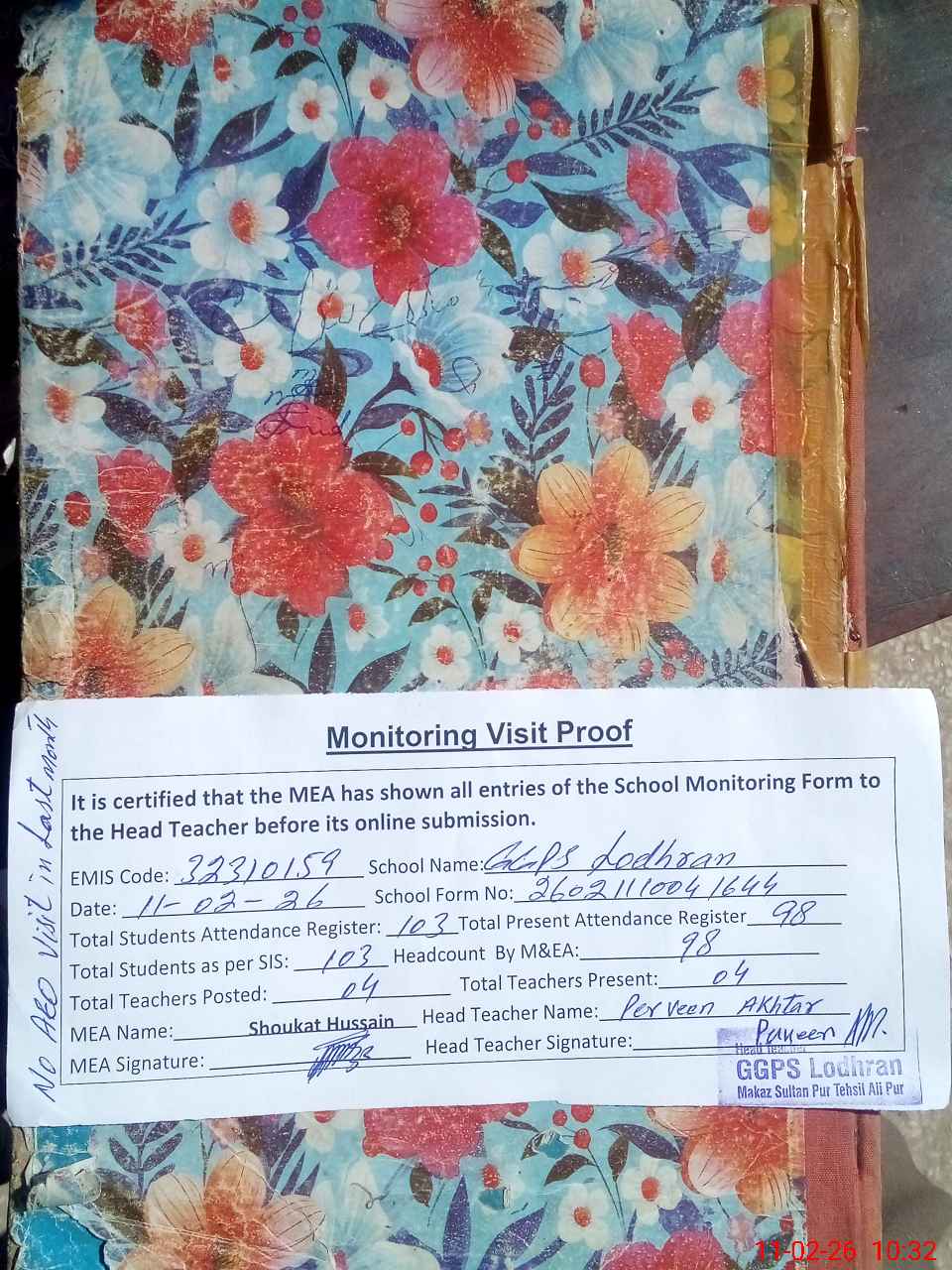 | EMIS Code: 32310159 | Name of School: GGPS LODHRAN | |||