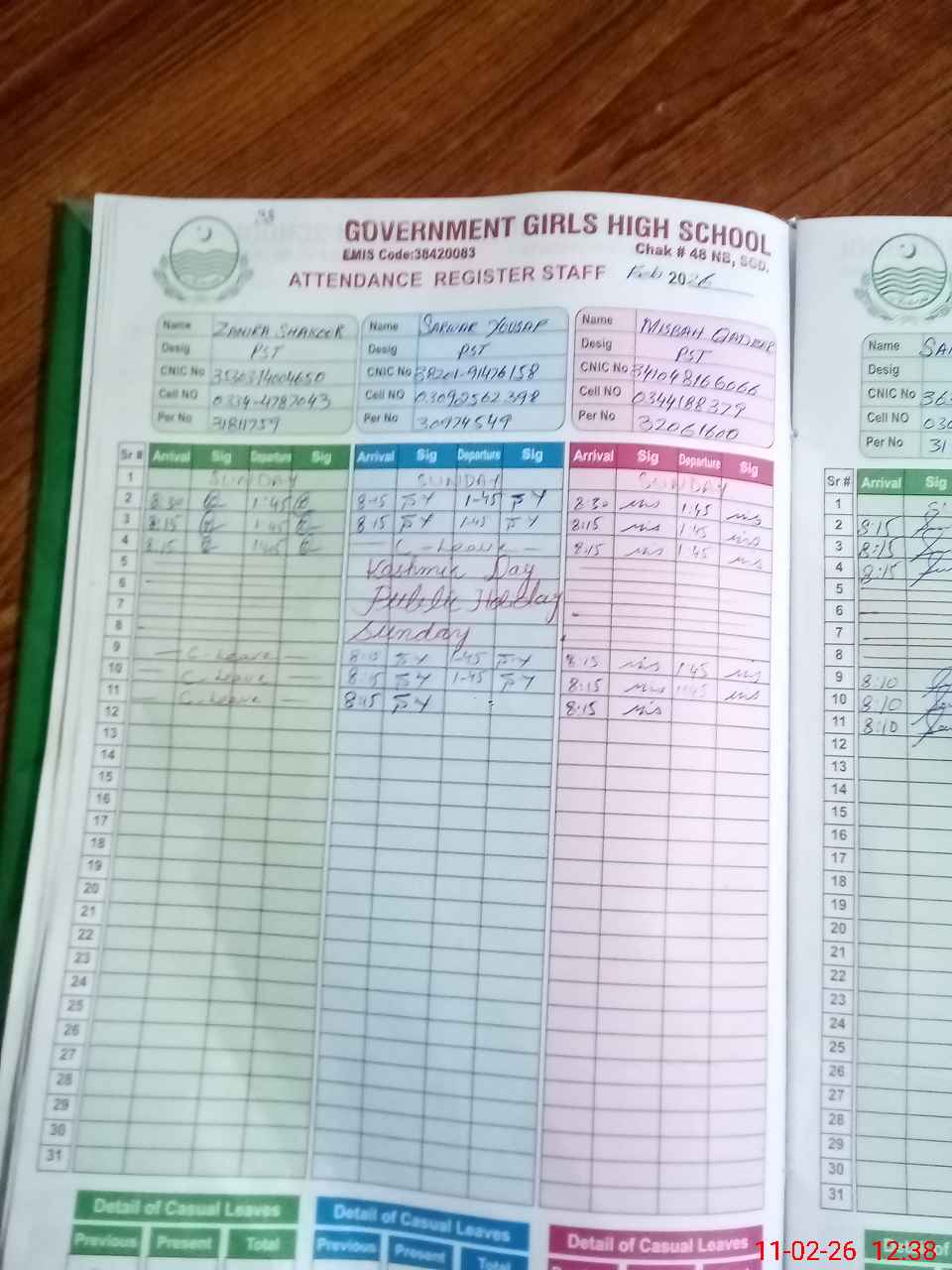 | CNIC | Full Name | Designation | R/C | Absence During Last Calender Month |