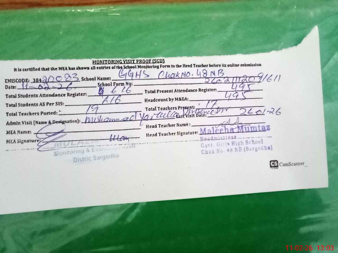 | Attendance Register | Head Teacher | MEA with School | Visit Proof |