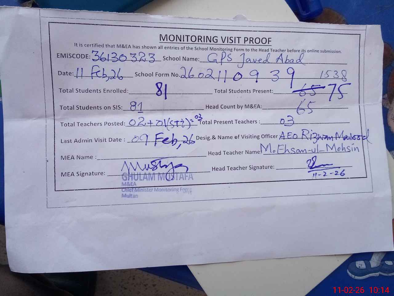 | Monitoring Date: 11-02-2026 | Start Time: 11-02-2026 09:39 AM | End Time: 11-02-2026 10:15 AM | Name of MEA: Gh**** Mu**** | |