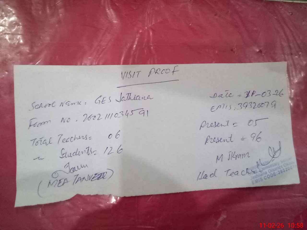 | Attendance Register | Head Teacher | MEA with School | Visit Proof |