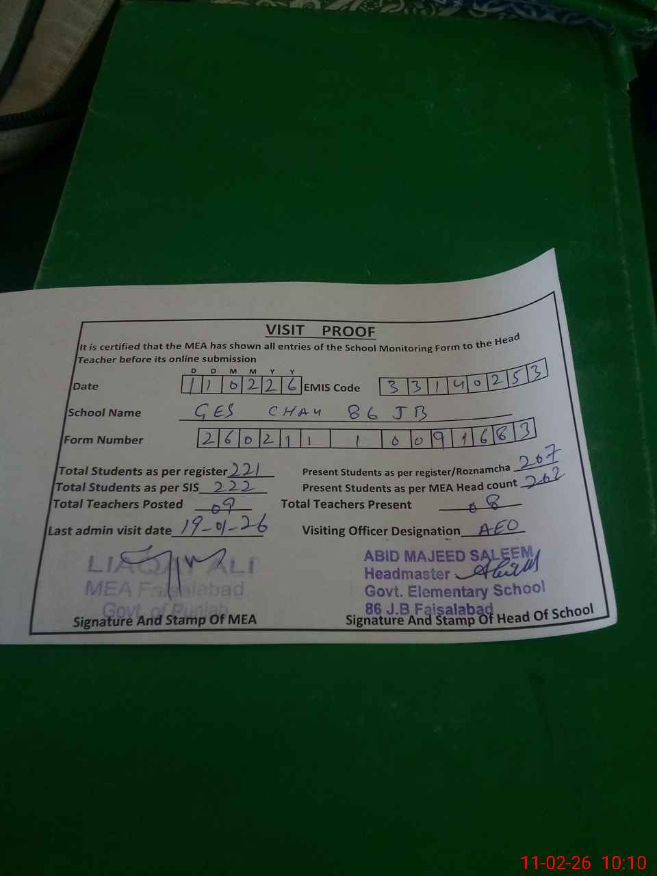 | Certified that this School was Inspected by the Undersigned MEA/DMO Today and the Information Stated Above is as Per Record. | |||||