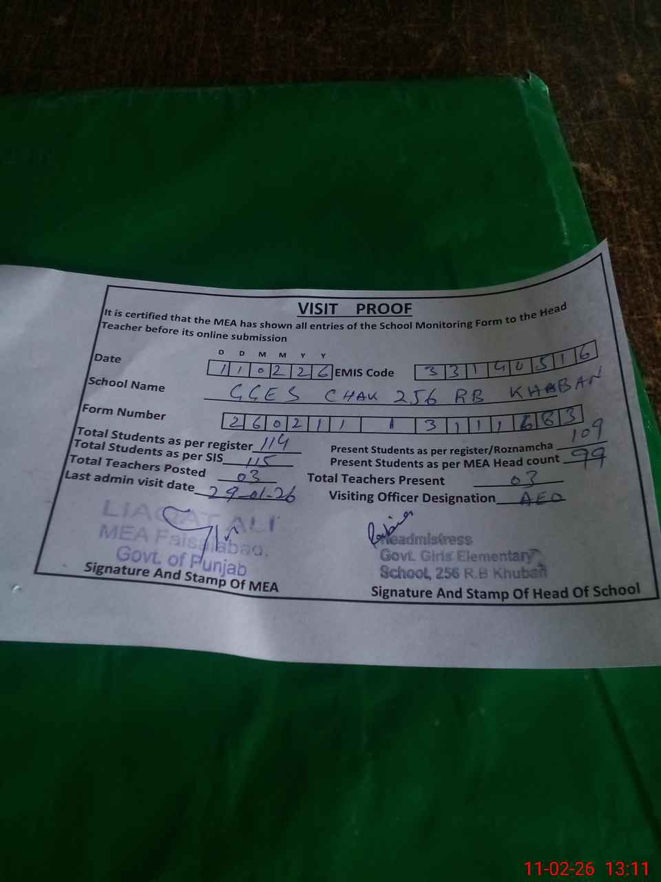 | Attendance Register | Head Teacher | MEA with School | Visit Proof |