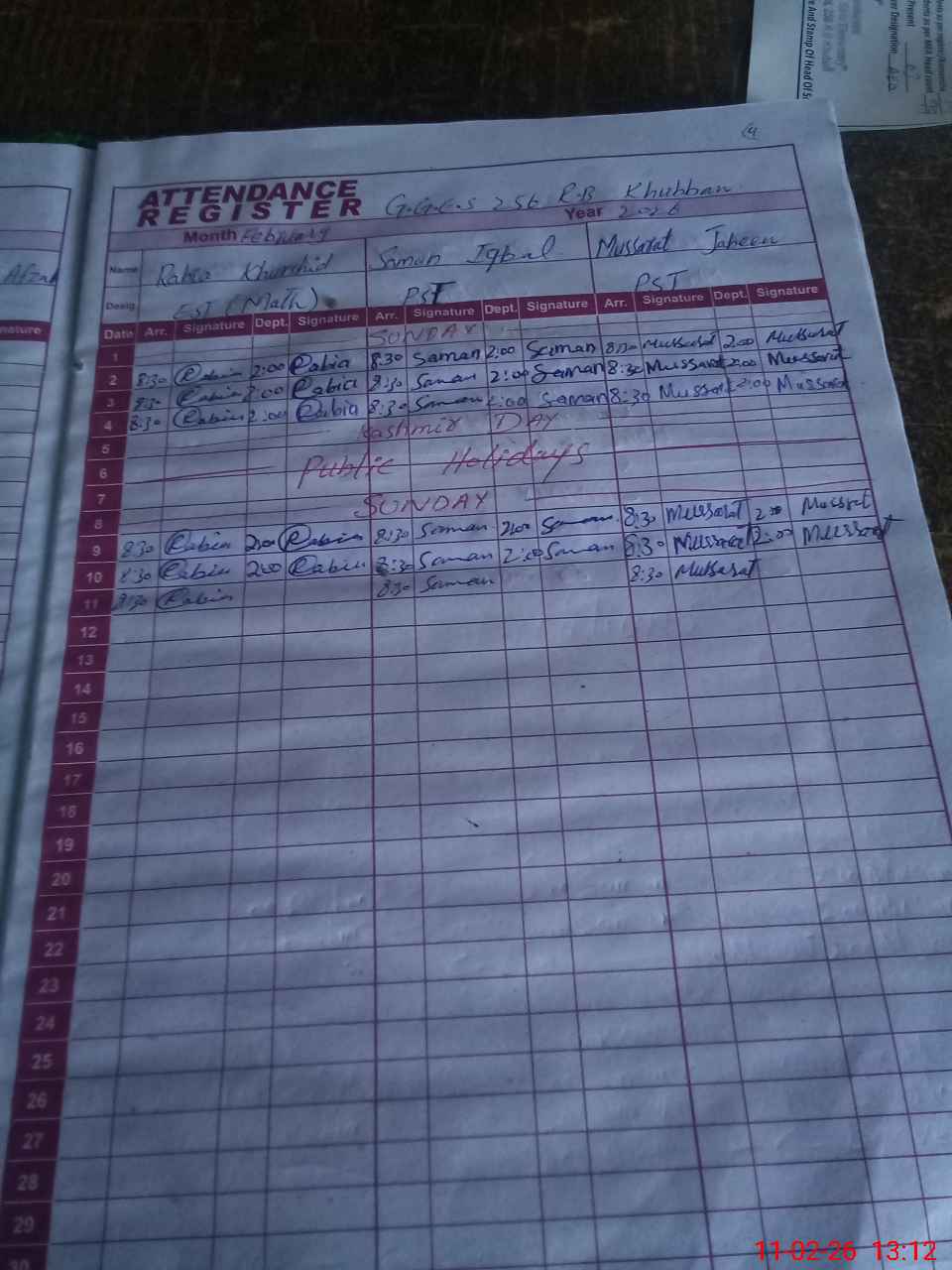 | CNIC | Full Name | Designation | R/C | Absence During Last Calender Month |