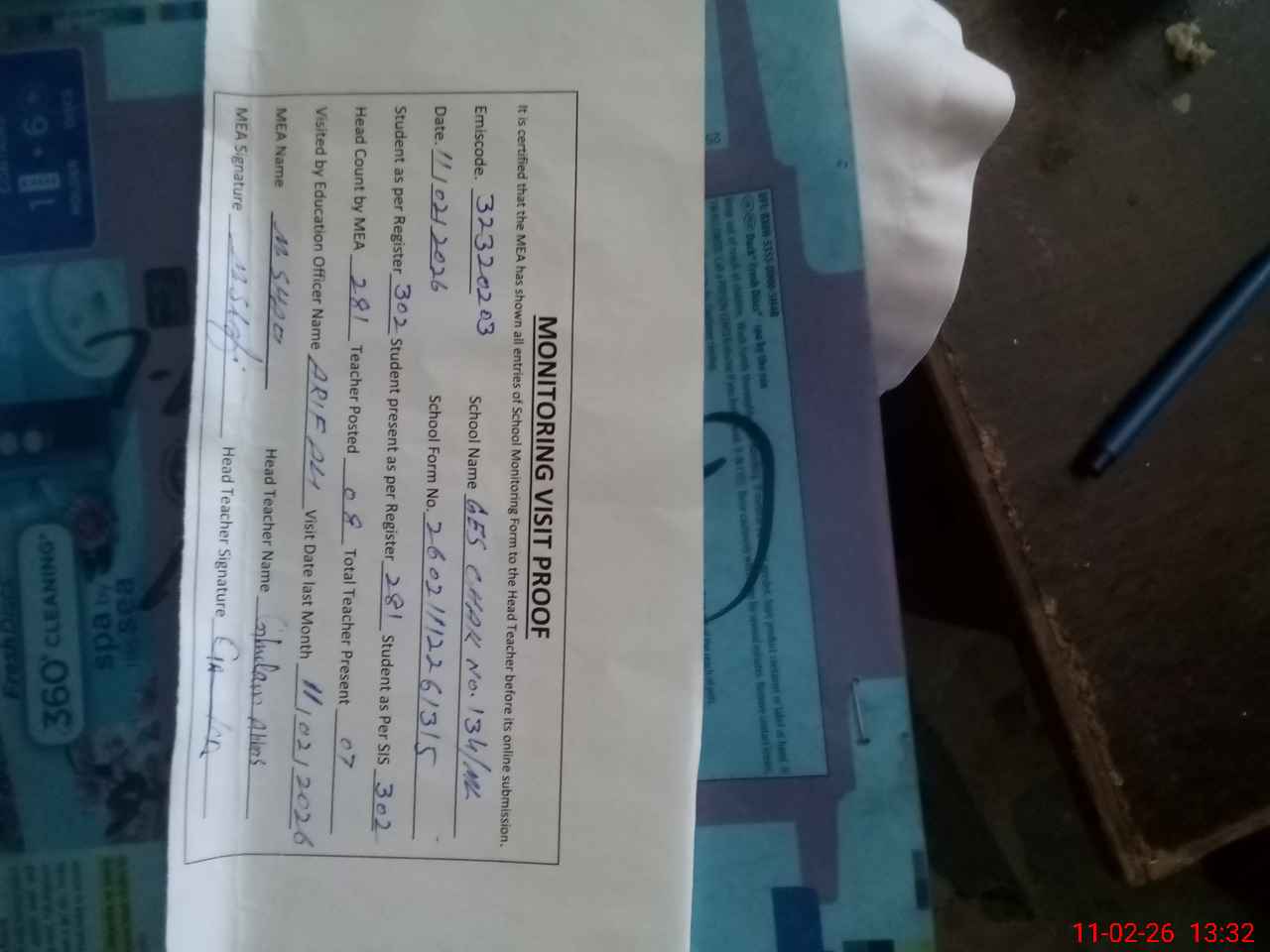 | Attendance Register | Head Teacher | MEA with School | Visit Proof |