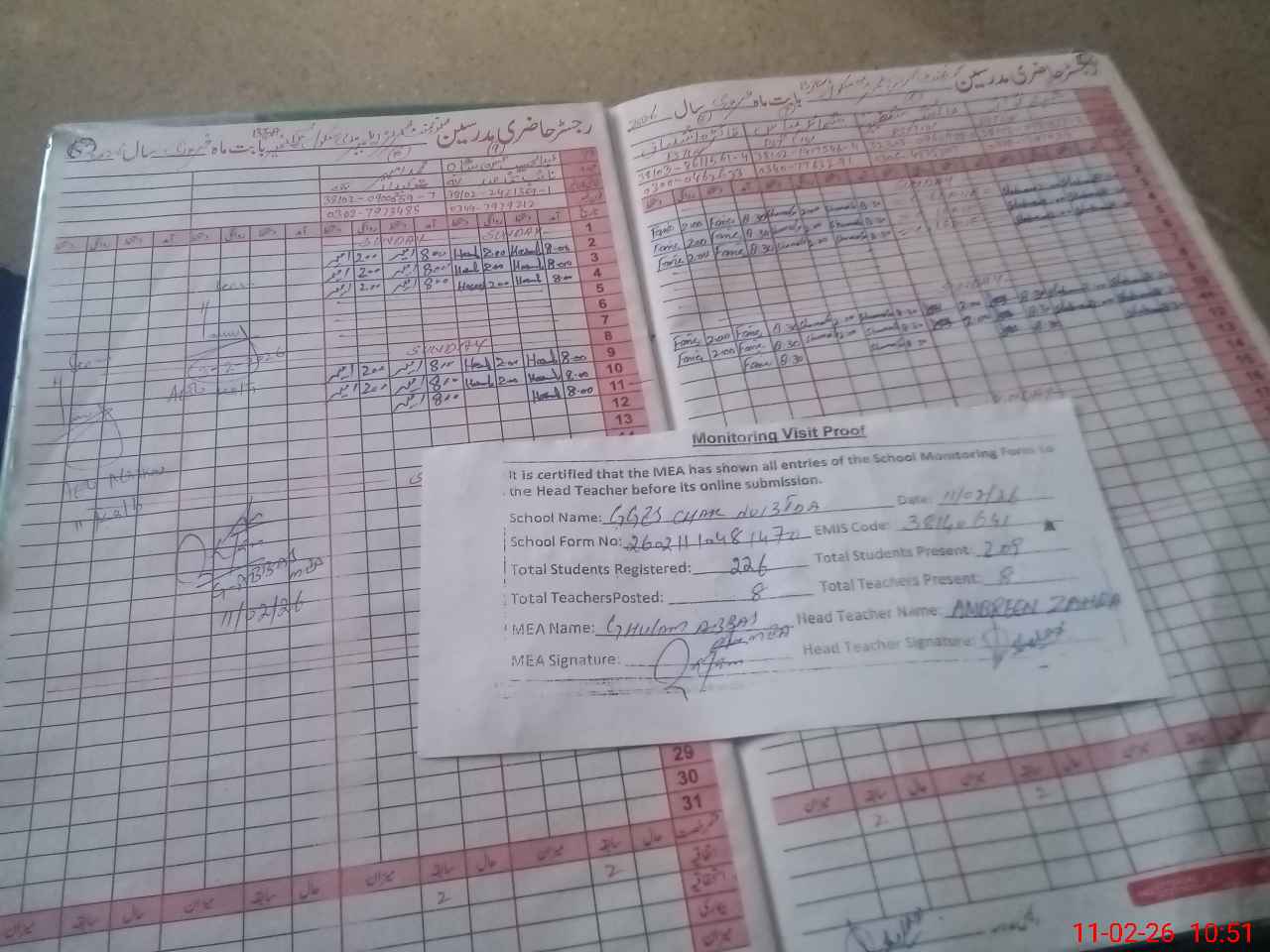 | Attendance Register | Head Teacher | MEA with School | Visit Proof |