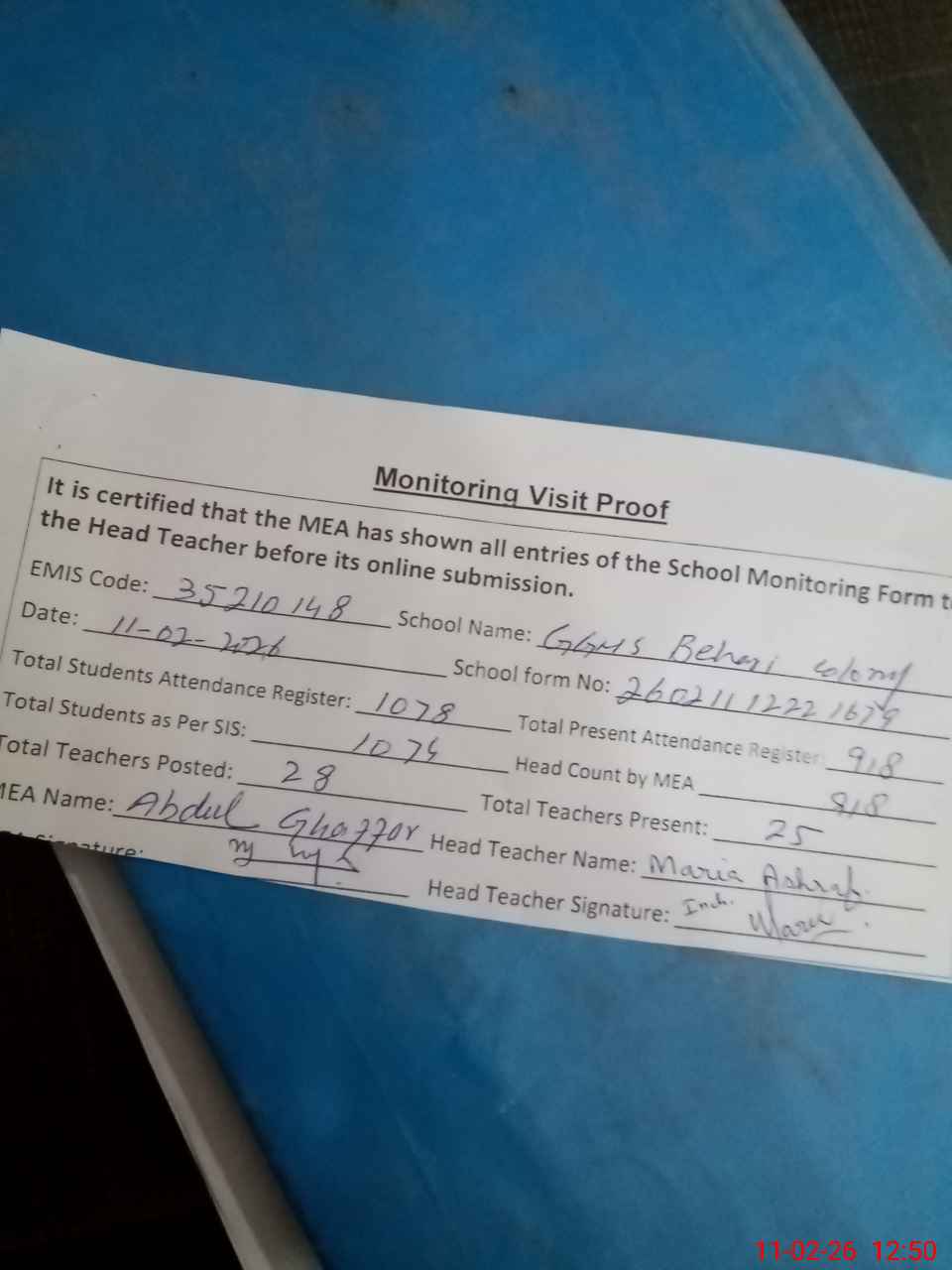 | Attendance Register | Head Teacher | MEA with School | Visit Proof |