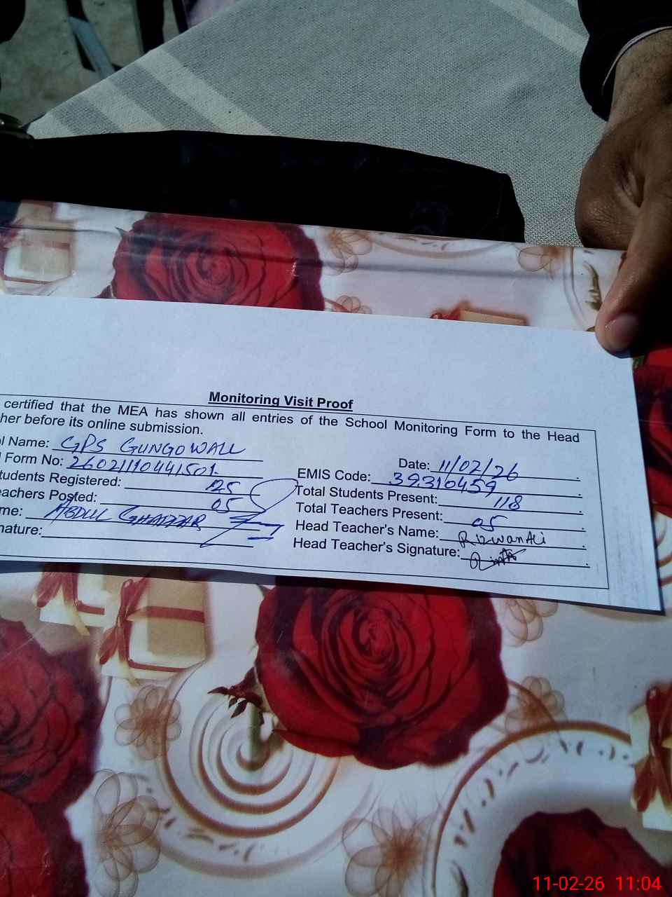 | Attendance Register | Head Teacher | MEA with School | Visit Proof |