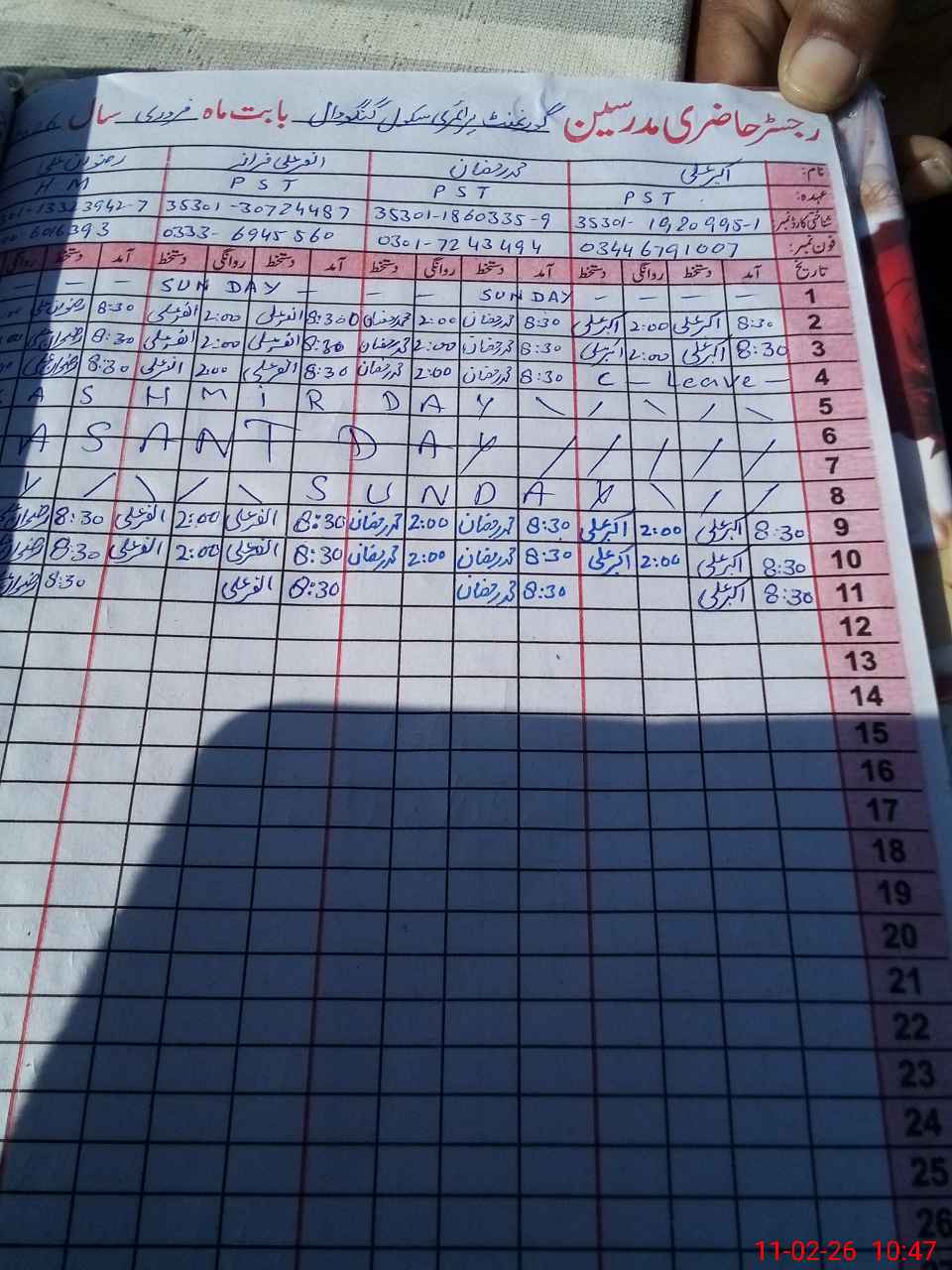 | CNIC | Full Name | Designation | R/C | Absence During Last Calender Month |