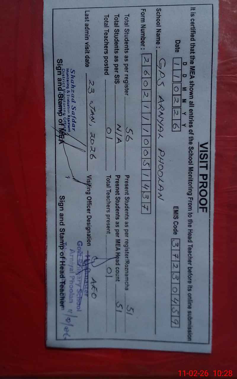 | EMIS Code: 37230459 | Name of School: GPS ARNYAL PHOOLAN | |||