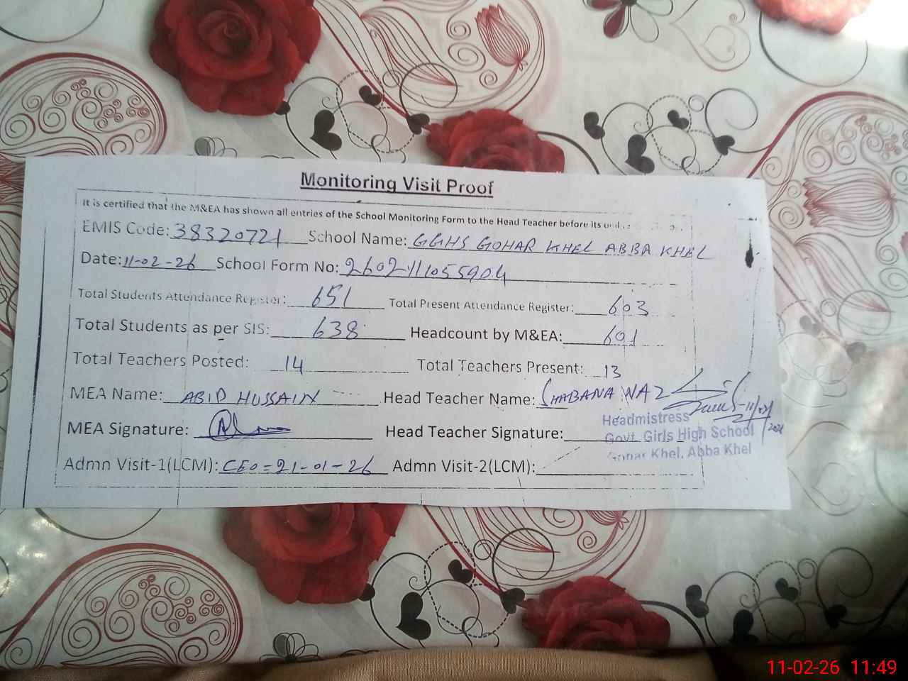 | EMIS Code: 38320721 | Name of School: GGHS GOHAR KHEL ABBA KHEL | |||