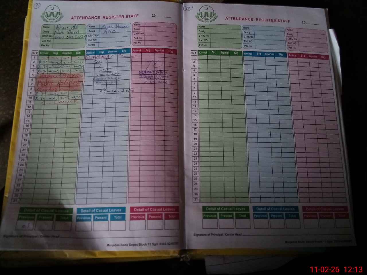 | CNIC | Full Name | Designation | R/C | Absence During Last Calender Month |