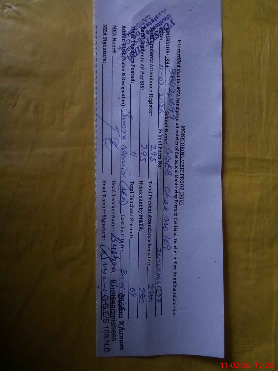 | Attendance Register | Head Teacher | MEA with School | Visit Proof |