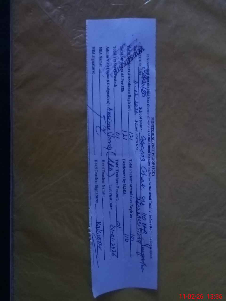 | Attendance Register | Head Teacher | MEA with School | Visit Proof |