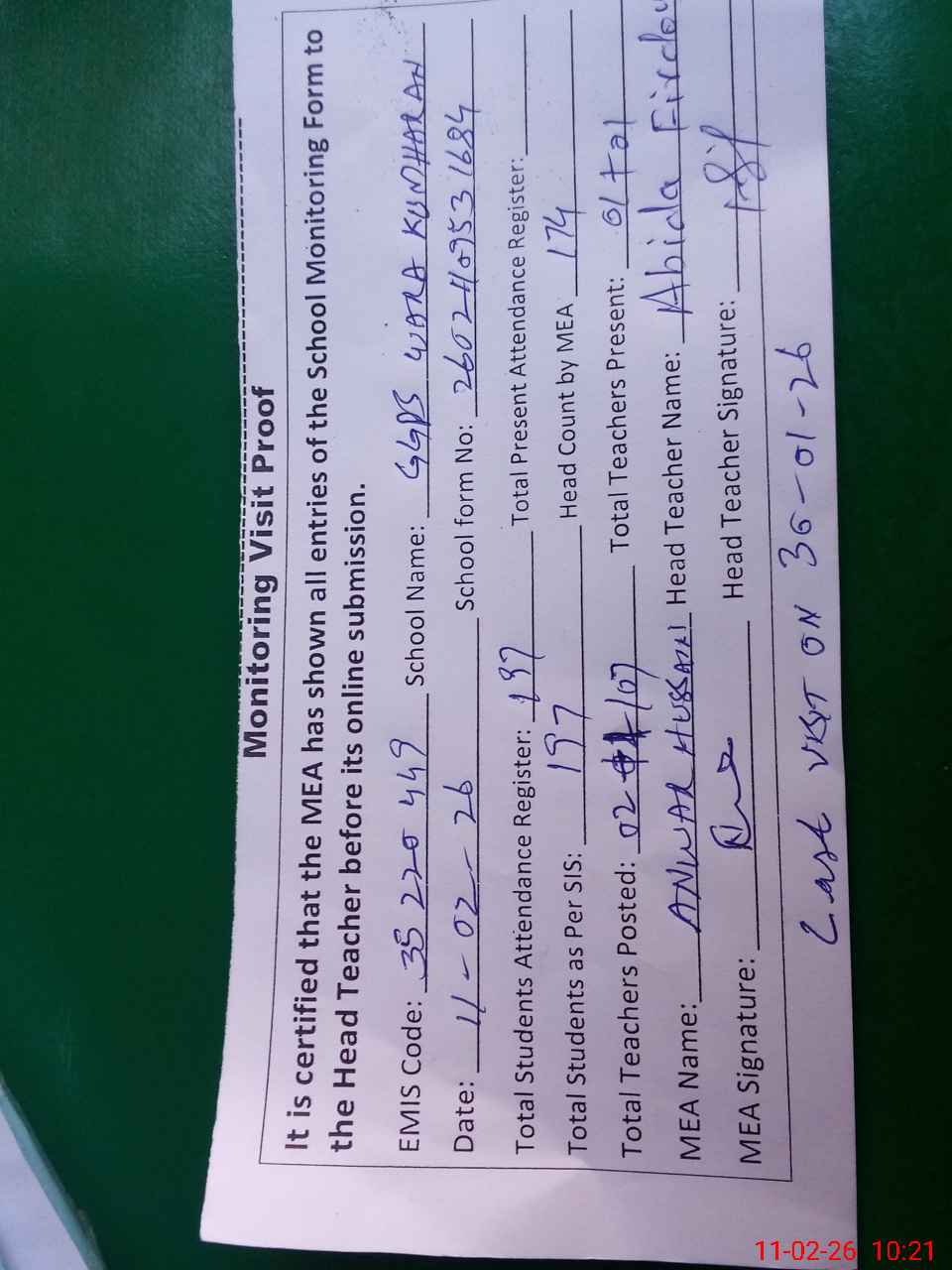 | Attendance Register | Head Teacher | MEA with School | Visit Proof |