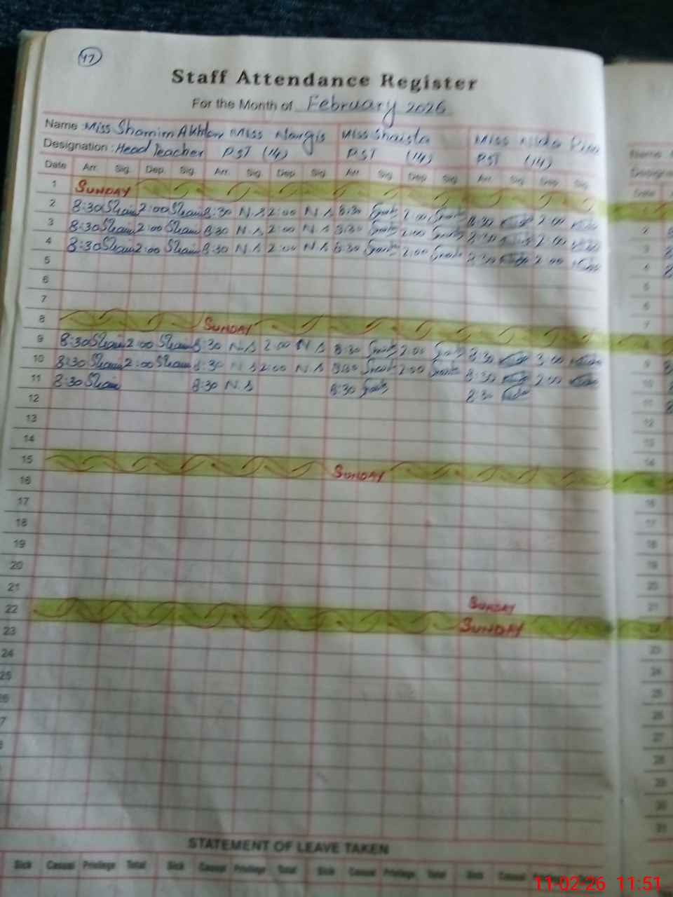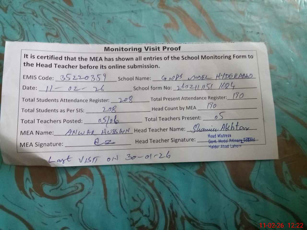 | Attendance Register | Head Teacher | MEA with School | Visit Proof |