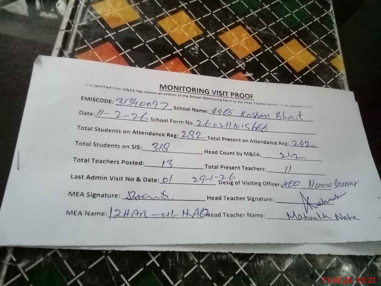 | Monitoring Date: 11-02-2026 | Start Time: 11-02-2026 09:47 AM | End Time: 11-02-2026 10:26 AM | Name of MEA: Mu**** Iz**** UlHa**** | |