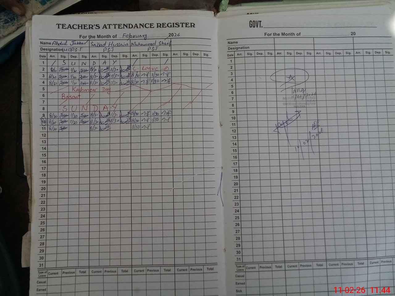 | Remarks (Use Separate Page if Required): HT PST ABDUL JABBAR ATTENDENCE MARKED BUT NOT AVAILABLE IN SCHOOL NOR ANY MOVEMENT RECORD AVAILABLE SO MARKED ABSENT TWO STUDENTS NAMES HELD IN STUDENTS ATTENDENCE LIST FATHER'S NAMES NOT CORRECT 7TH CLASS STUDENTS ATTENDENCE REGISTER NOT BEING MAINTAINED SINCE 01 FEBRUARY 2025 | |||||