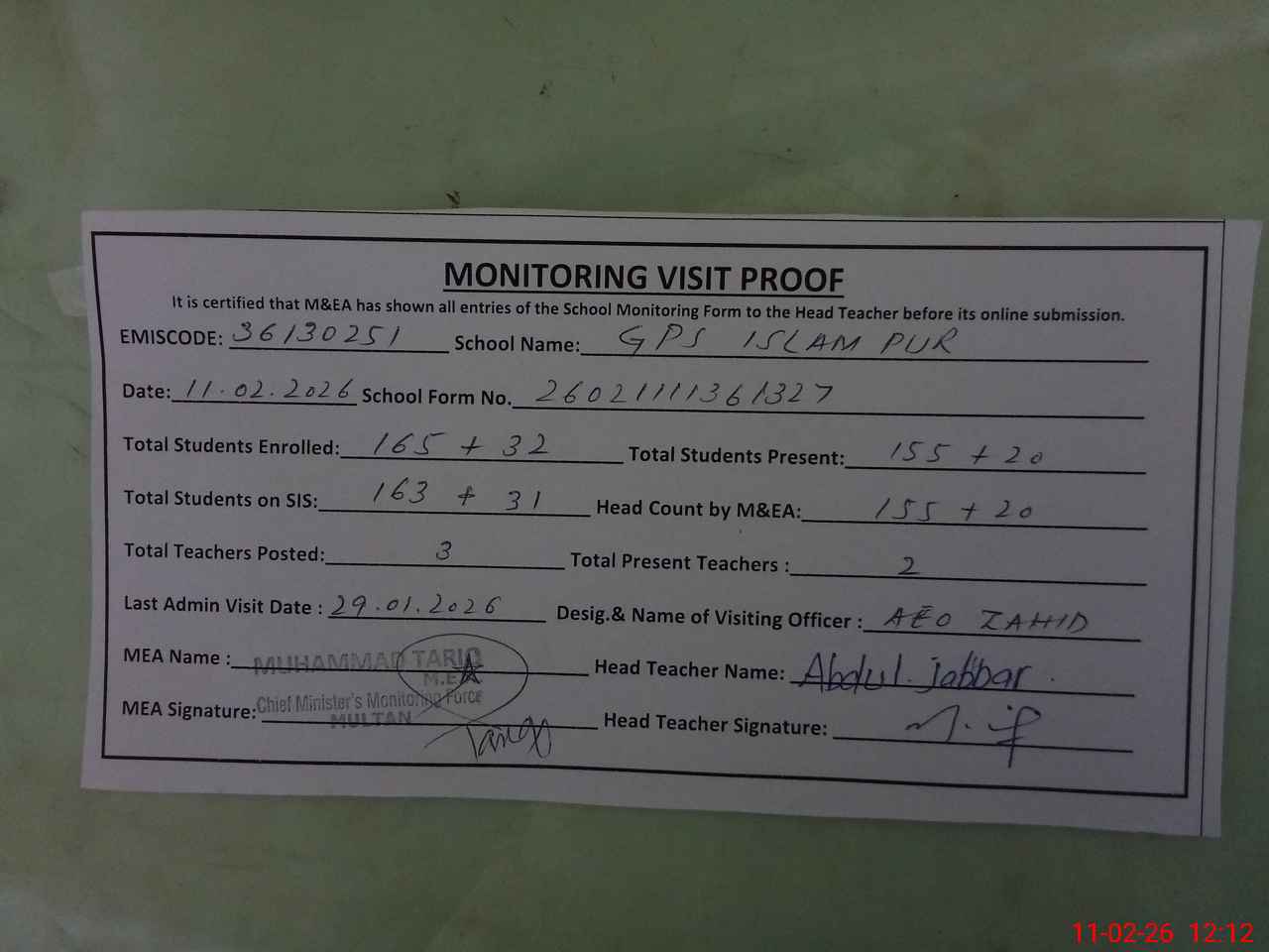 | EMIS Code: 36130251 | Name of School: GPS ISLAM PUR MARRAL P/O QADIR PUR LAR | |||