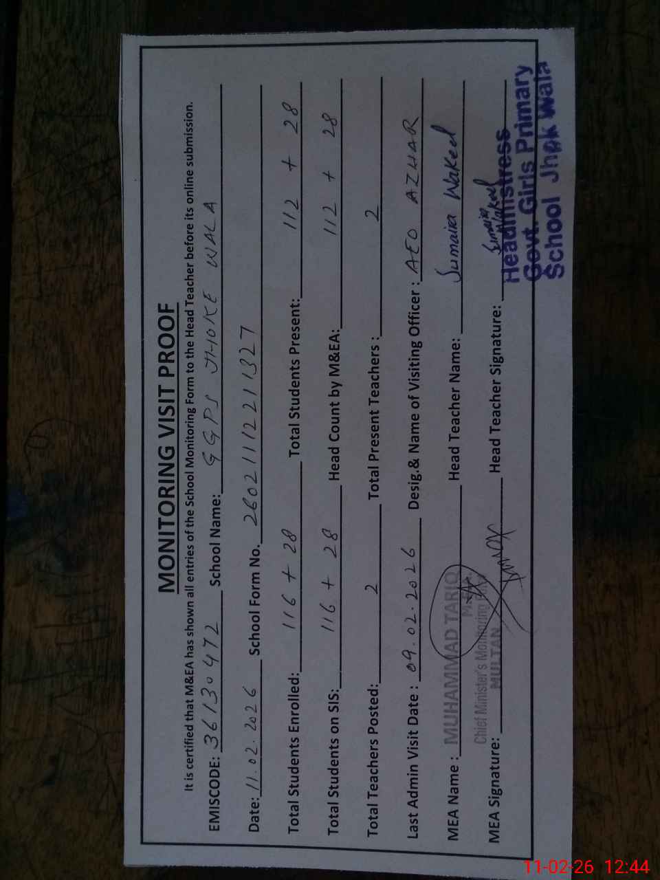 | Attendance Register | Head Teacher | MEA with School | Visit Proof |