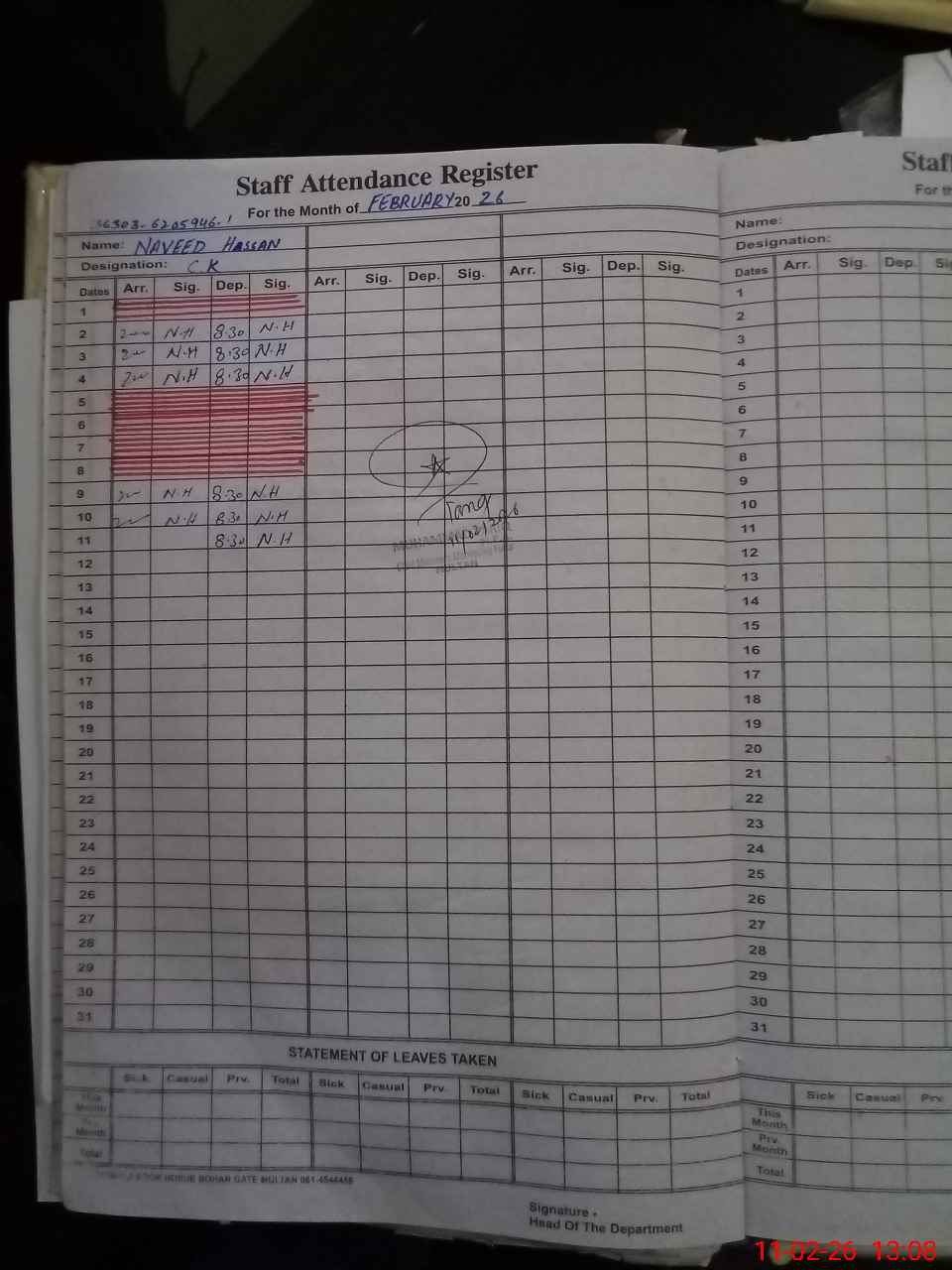 | CNIC | Full Name | Designation | R/C | Absence During Last Calender Month |