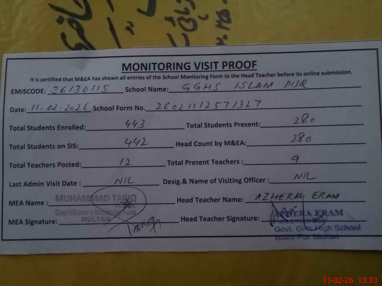 | Attendance Register | Head Teacher | MEA with School | Visit Proof |